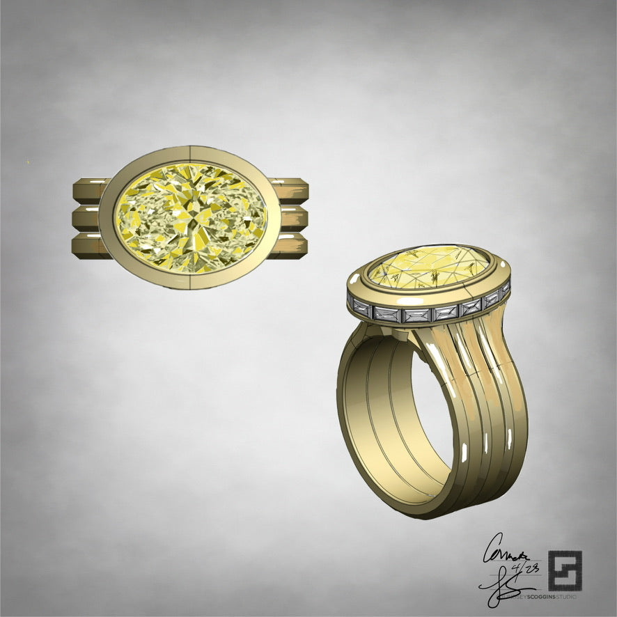 The final design is similar to the original, switching a white diamond for a yellow diamond and rotating the diamond to an east west setting instead of the traditional look of the original design. The baguette diamond halo around the center stone adds even more sparkle and is a beautiful touch next to the yellow diamond and 18k yellow gold band. The wide band adds an additional modern design detail with grooved lines for a sculptural feel.