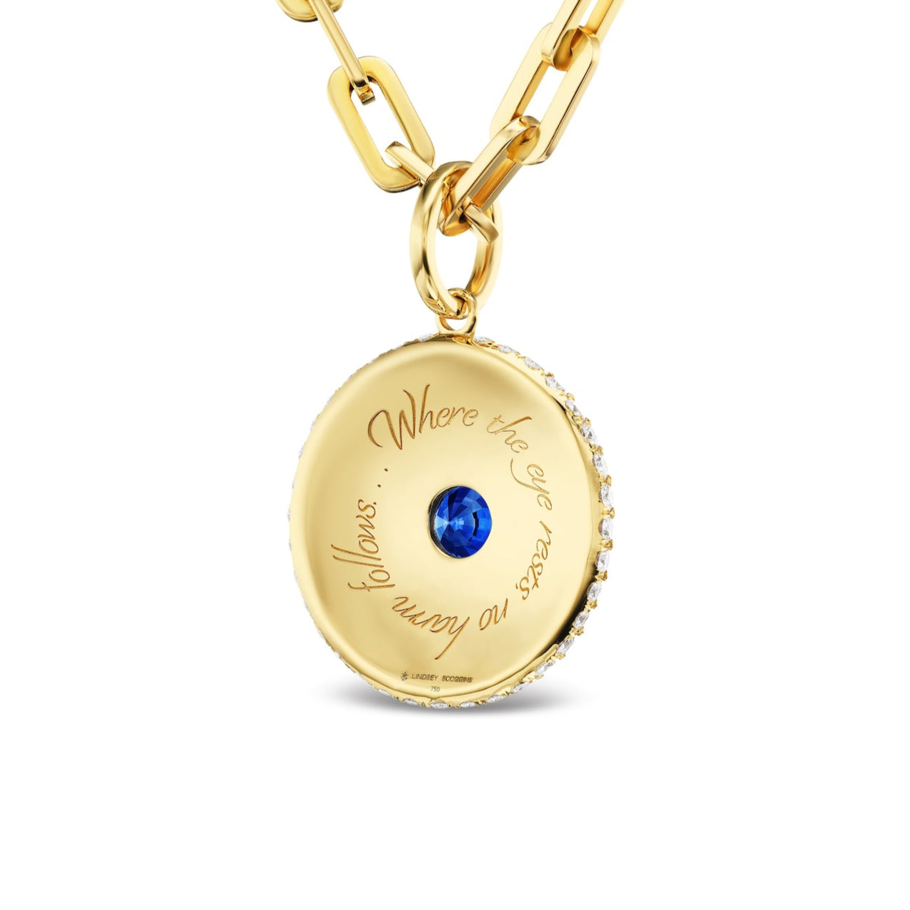 Our newest edition to our evil eye necklaces, the medallion is a different take on the evil eye. This style is a bit more abstract with a sapphire at the center surrounded by blue zircon and pavé diamonds. The back is engraved with a beautiful reminder, "where the eye rests, no harm follows..." We could customize this medallion with any engraving of your choice and could also modify the gemstones or pavé diamonds.