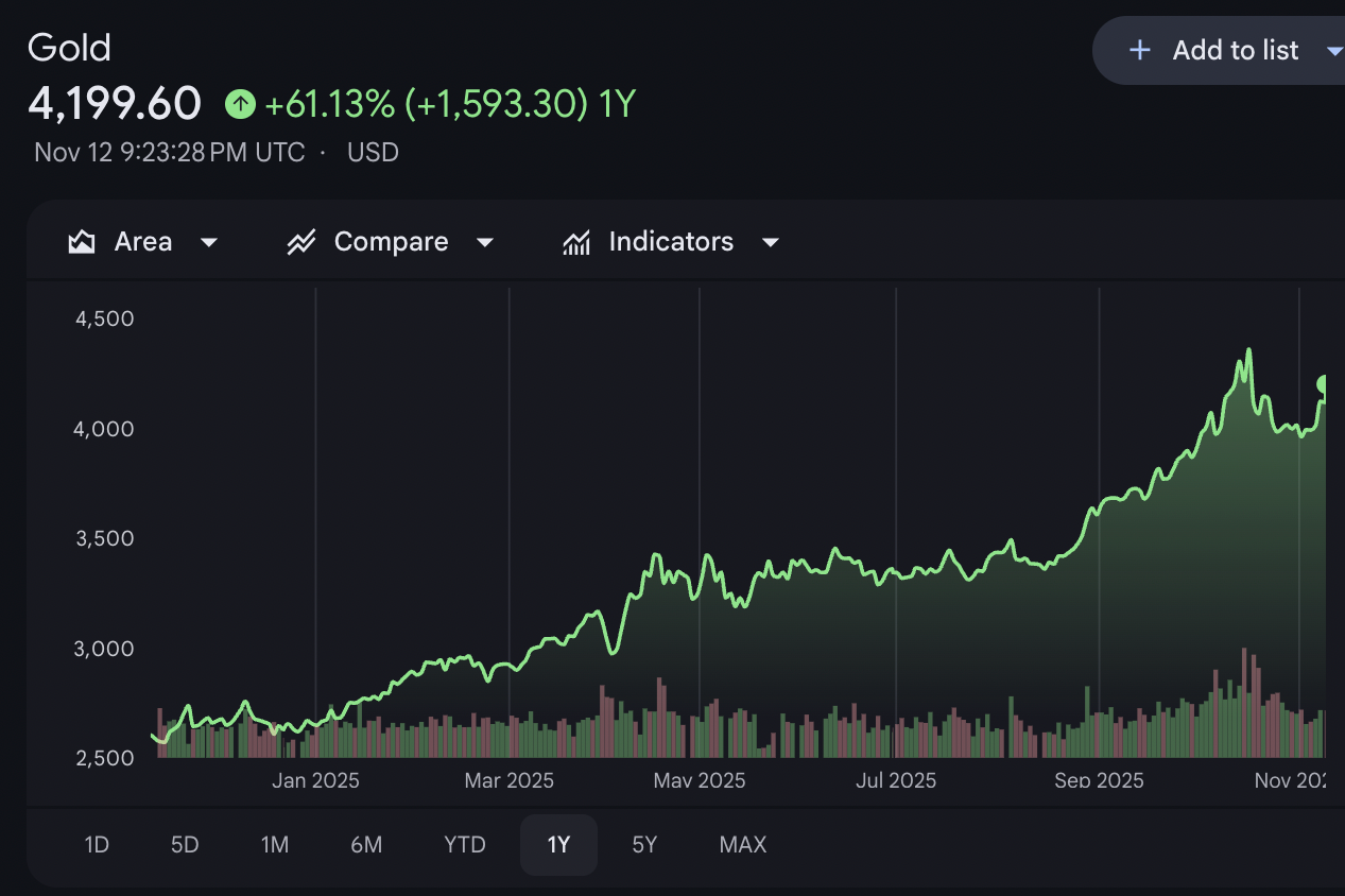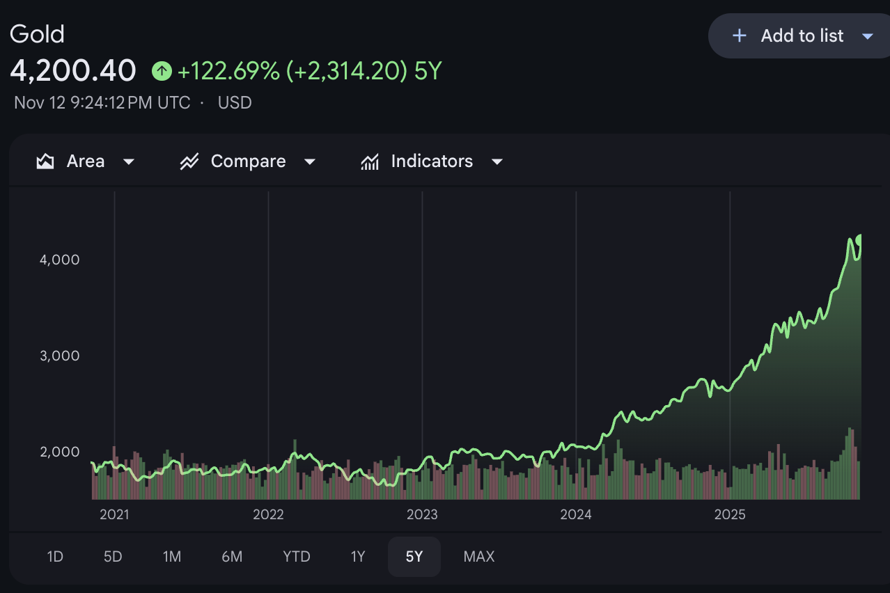 These charts show the price of gold over one and five years from google.com/finance as of November 12,2025.