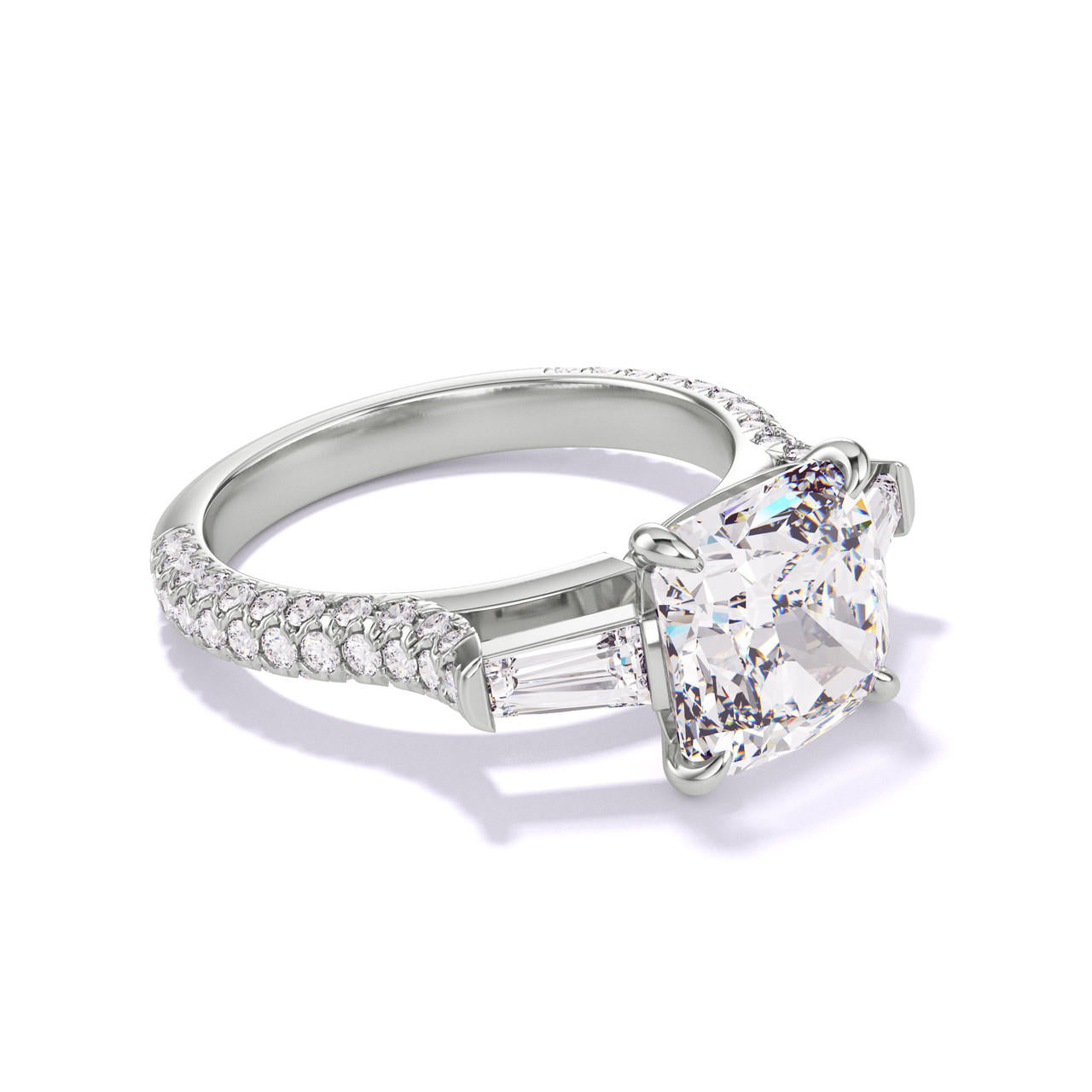 CUSHION CUT DIAMOND ENGAGEMENT RING WITH A BAGUETTE FLANK THREE PHASES TRIPLE PAVE SETTING IN PLATINUM