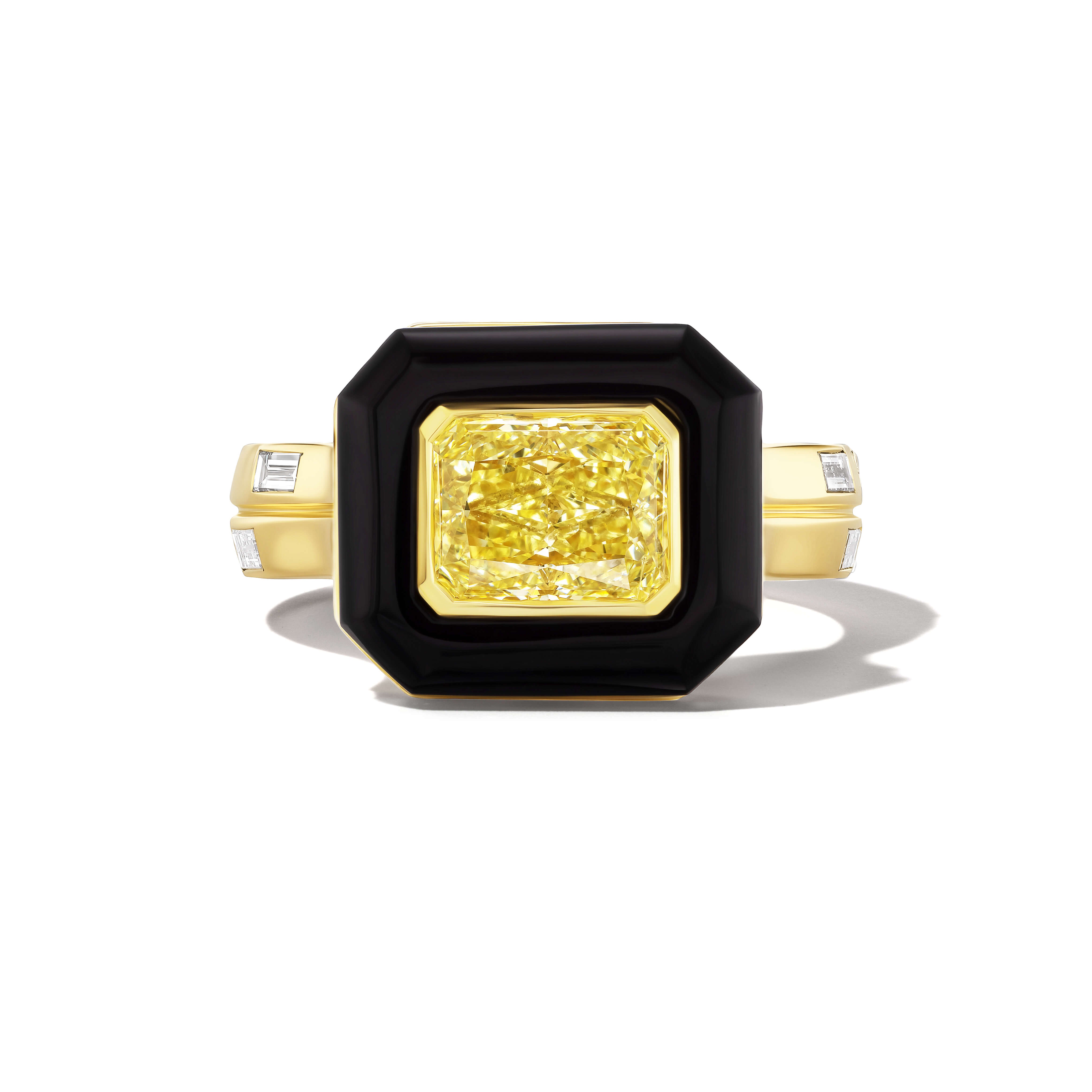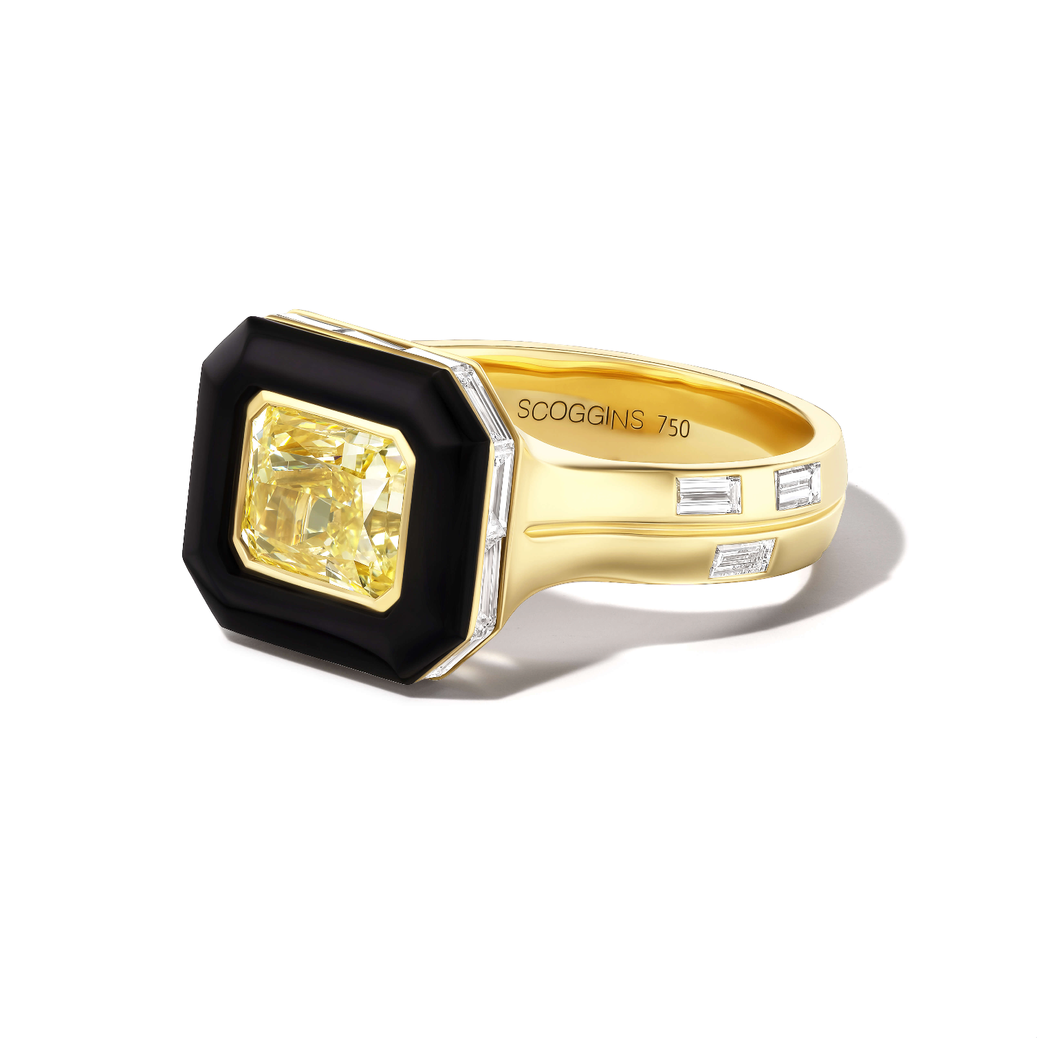 Our newest bespoke design from the Shield collection, this stunning engagement ring sets an east west emerald cut yellow diamond with an onyx frame and a baguette diamond halo. The band features scattered diamonds set in 18k yellow gold.