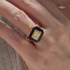 SHIELD EAST WEST EMERALD CUT YELLOW DIAMOND AND ONYX ENGAGEMENT RING