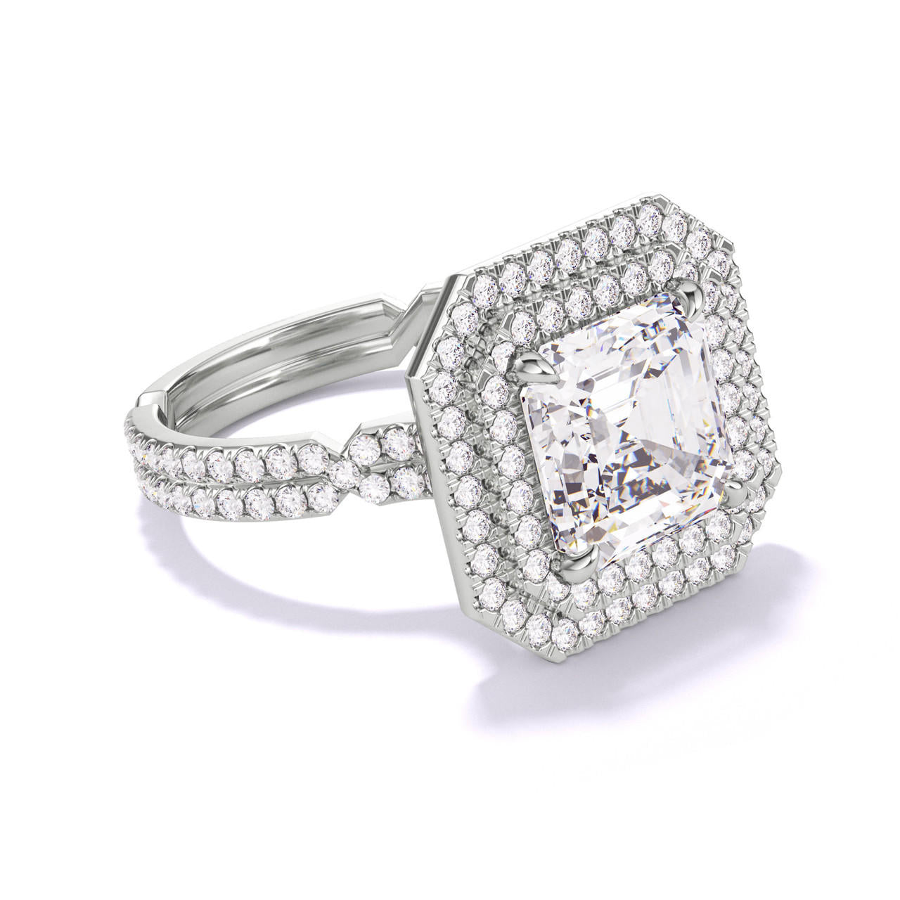 ASSCHER CUT DIAMOND ENGAGEMENT RING WITH A DOUBLE HALO CHANCE PAVE SETTING IN PLATINUM