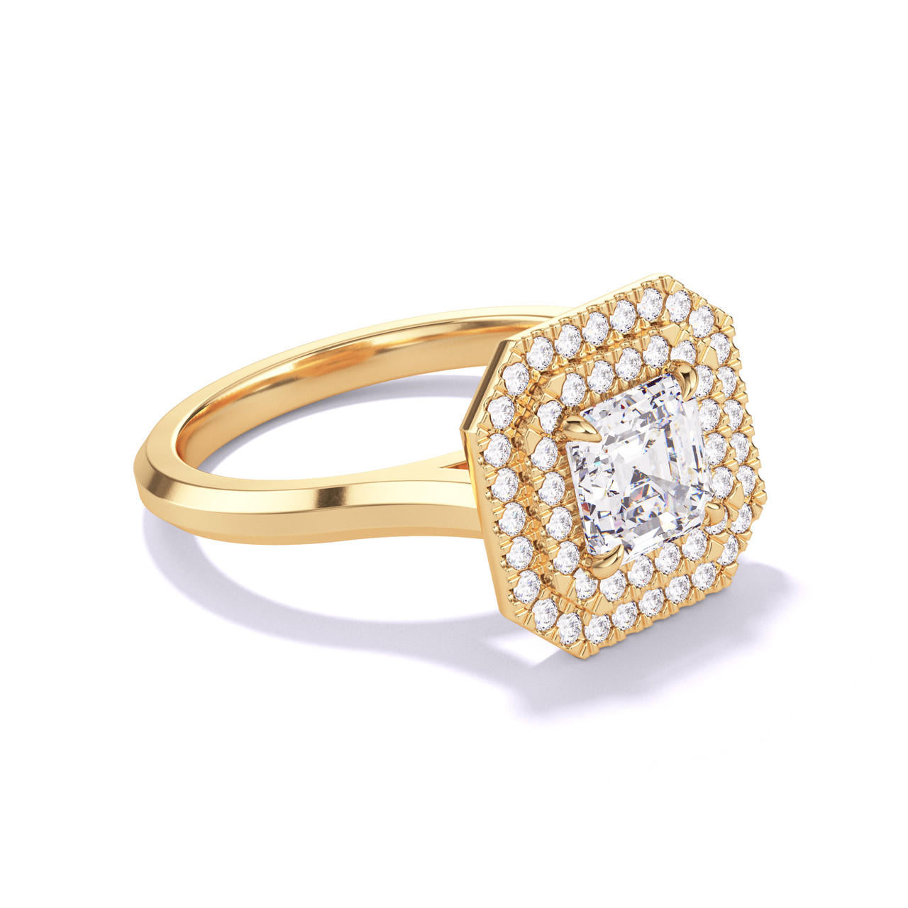 ASSCHER CUT DIAMOND ENGAGEMENT RING WITH A DOUBLE HALO THREE PHASES SLIM SETTING IN 18K YELLOW GOLD