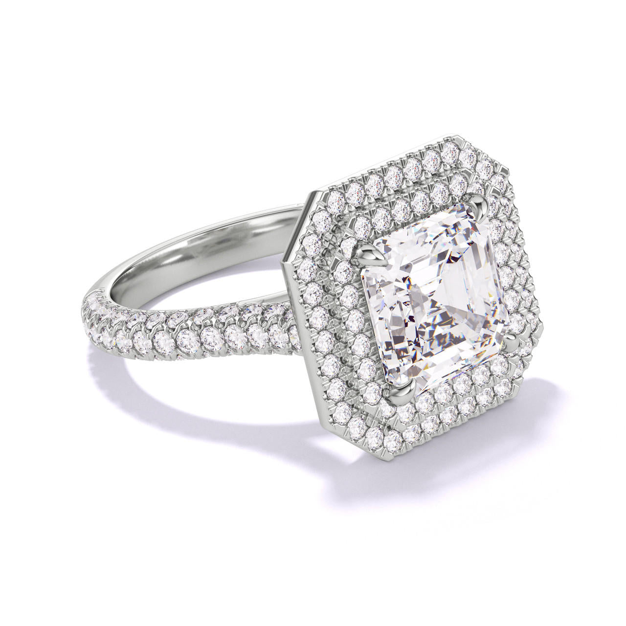 ASSCHER CUT DIAMOND ENGAGEMENT RING WITH A DOUBLE HALO THREE PHASES TRIPLE PAVE SETTING IN PLATINUM