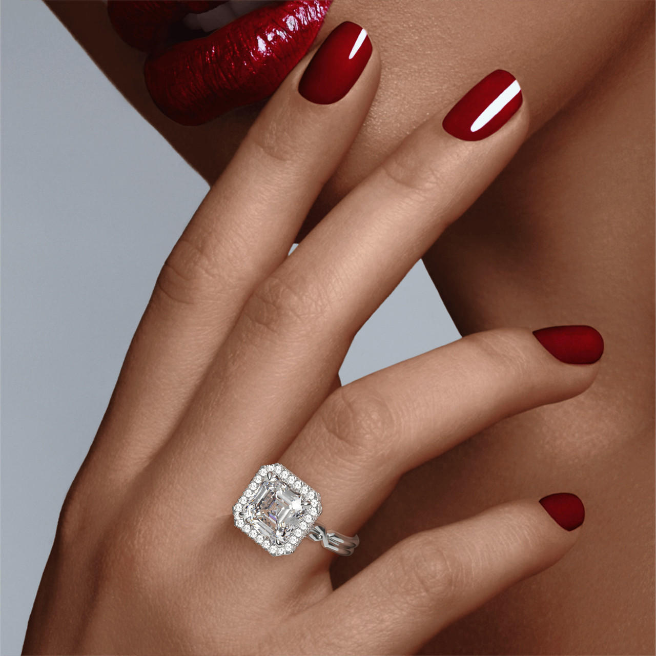 All Lindsey Scoggins Studio engagement rings are made exclusively for you in New York City’s Diamond District. Your Asscher halo engagement ring will be made to precisely fit your diamond and finger. The carat weight of this setting is approximately 0.5 carats for a size 6 and varies slightly by ring size.