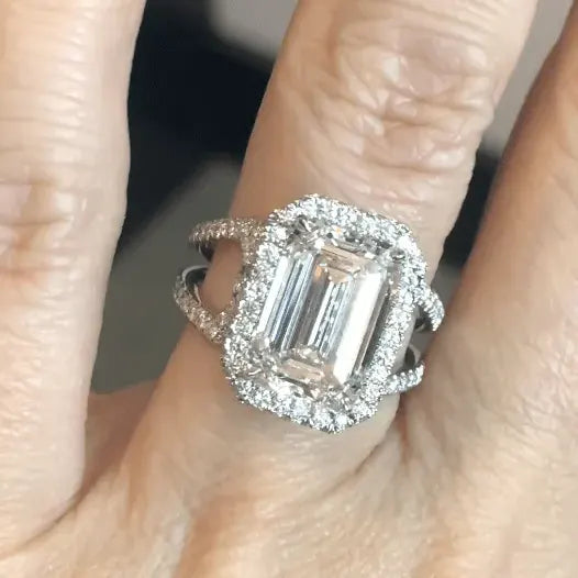 This custom engagement ring features an emerald cut diamond that is nearly five carats with a wrapped halo setting on a unique platinum pave diamond band. This stunning ring came to life in the middle of the pandemic and was a tenth anniversary surprise gift for our client's wife.