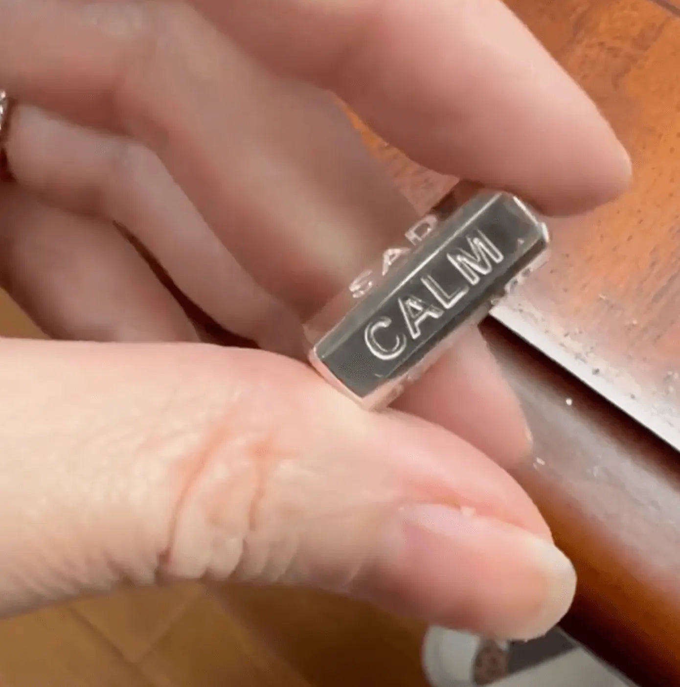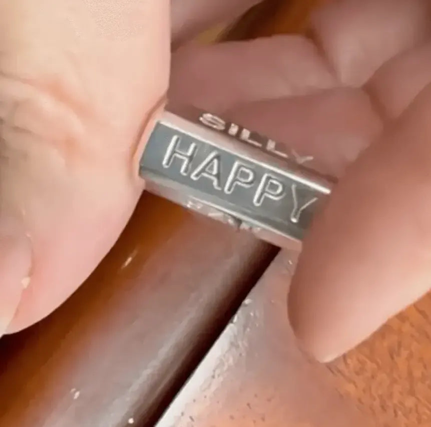 This sweet piece started as an idea from Lindsey's niece who asked for a necklace to express her feelings. She chose all of the emotions including happy, joyful, silly, sad and calm. Ideas were exchanged over summer camp letters, followed by an official design session with the final piece being a rondel type of bead that is strung on a sterling silver chain and rotated to the emotion of her choice.