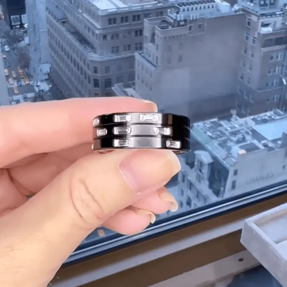 This custom men's ring was a surprise gift from a client who wanted to give her husband an updated wedding band that would match her recently redesigned engagement ring. The design is a version of our Energy band with a titanium plating and 9 scattered baguette diamonds.