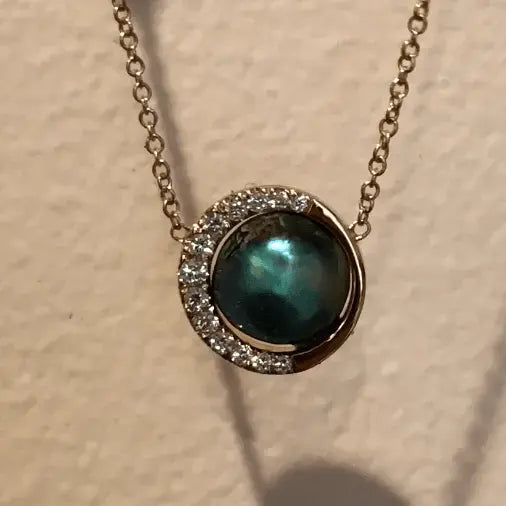 We like to call this our Britney Spears inspired necklace because our client literally went to the bottom of the ocean while diving to find the abalone pearl used in this design. It's a real life "Oops, I Did It Again" Britney Spears moment.
