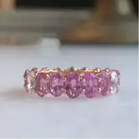 This one of a kind eternity band is a Barbie dream ring. To create this design we started by sourcing these stunning pink sapphires in a gradient of brighter pinks to lighter colored gems to form a shaded gradient. Set in warm 18 karat rose gold to compliment the rosy hues of the stones, this ring is the perfect unique statement ring.