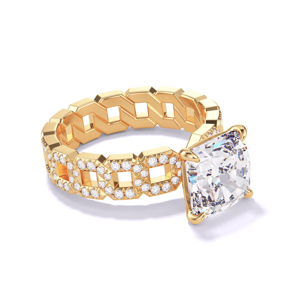 CUSHION CUT DIAMOND ENGAGEMENT RING WITH A CLASSIC 4 PRONG 16 PAVE LINKS SETTING IN 18K YELLOW GOLD