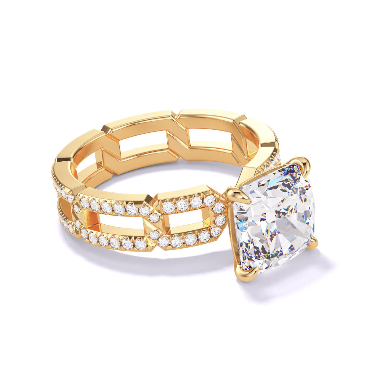 CUSHION CUT DIAMOND ENGAGEMENT RING WITH A CLASSIC 4 PRONG 8 PAVE LINKS SETTING IN 18K YELLOW GOLD