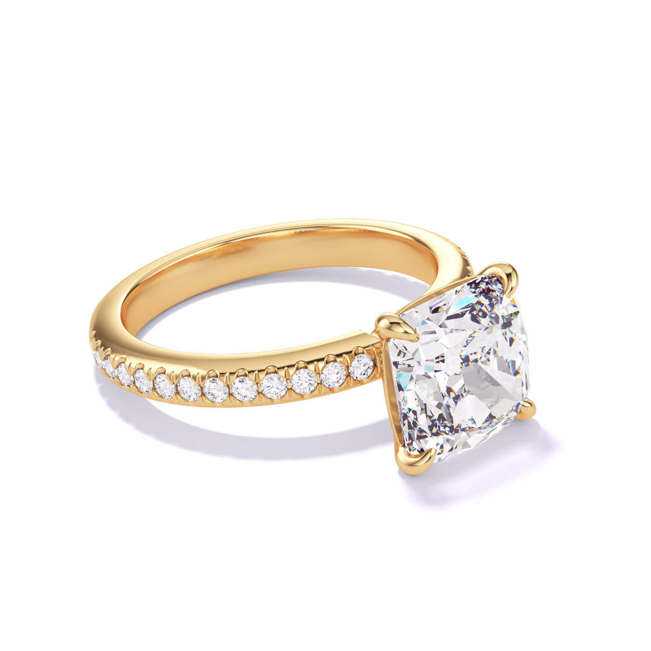 CUSHION CUT DIAMOND ENGAGEMENT RING WITH A CLASSIC 4 PRONG THREE PHASES PAVE SETTING IN 18K YELLOW GOLD