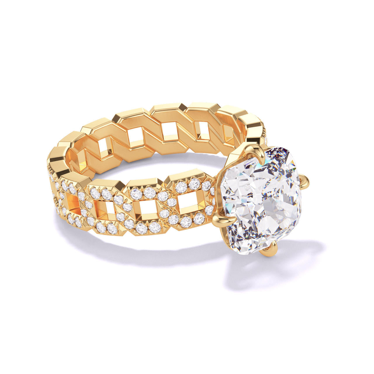 CUSHION CUT DIAMOND ENGAGEMENT RING WITH A COMPASS 4 PRONG 16 PAVE LINKS SETTING IN 18K YELLOW GOLD