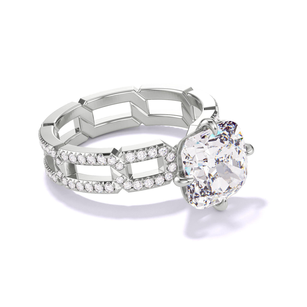 CUSHION CUT DIAMOND ENGAGEMENT RING WITH A COMPASS 4 PRONG 8 PAVE LINKS SETTING IN PLATINUM