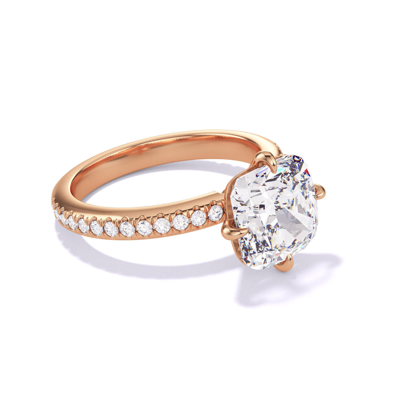 CUSHION CUT DIAMOND ENGAGEMENT RING WITH A COMPASS 4 PRONG THREE PHASES PAVE SETTING IN 18K ROSE GOLD