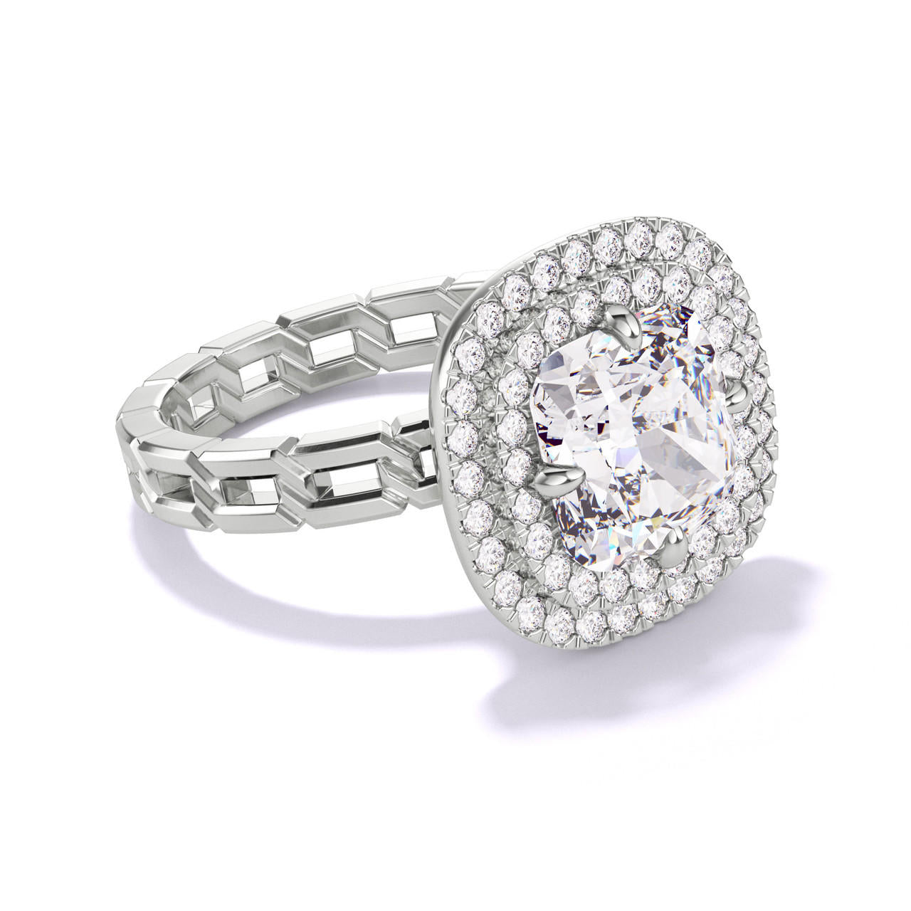 CUSHION CUT DIAMOND ENGAGEMENT RING WITH A DOUBLE HALO 16 LINKS SETTING IN PLATINUM