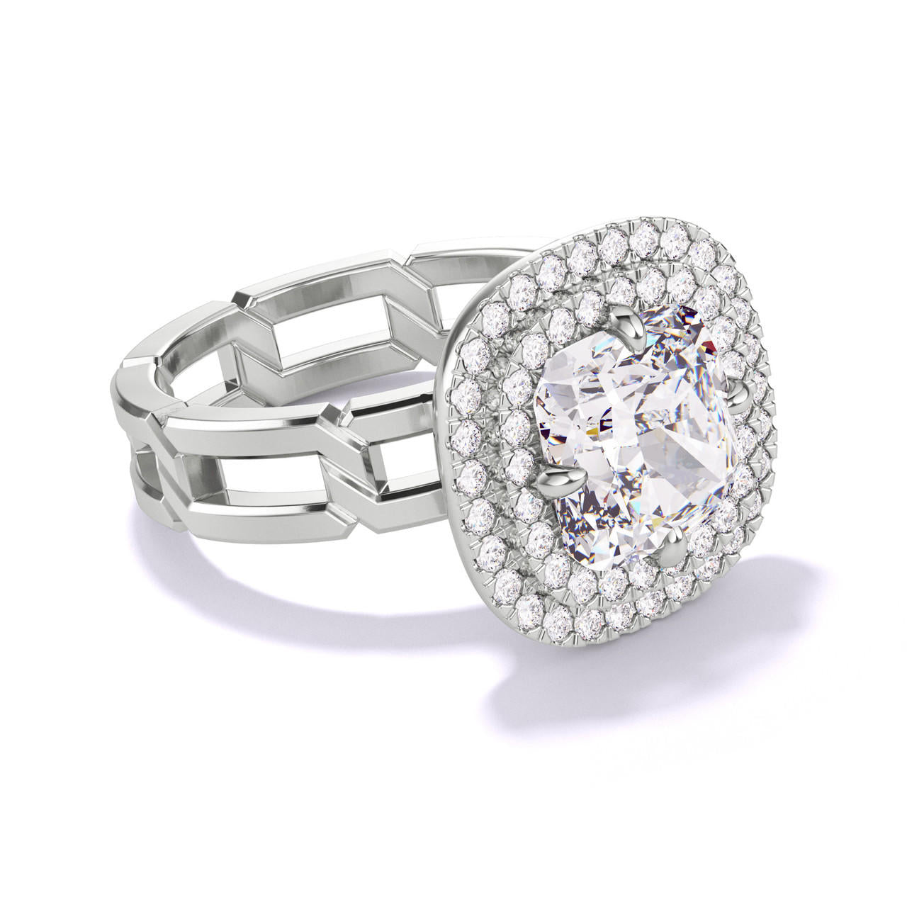 CUSHION CUT DIAMOND ENGAGEMENT RING WITH A DOUBLE HALO 8 LINKS SETTING IN PLATINUM