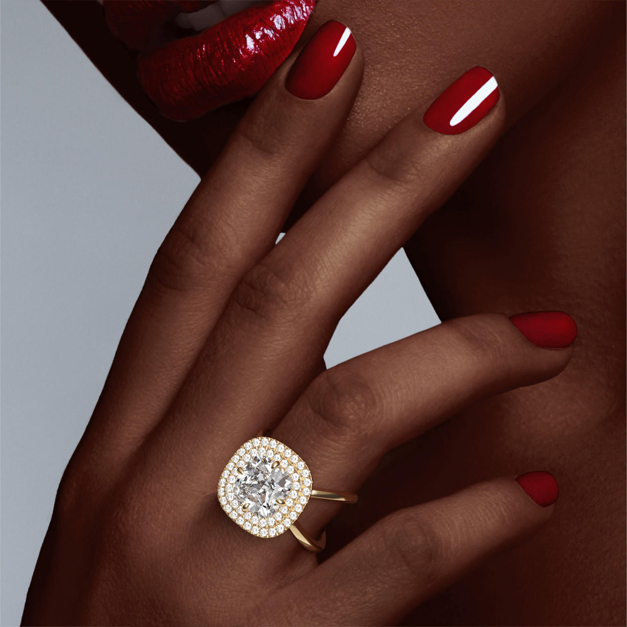 CUSHION CUT DIAMOND ENGAGEMENT RING WITH A DOUBLE HALO AXIS SETTING IN 18K YELLOW GOLD