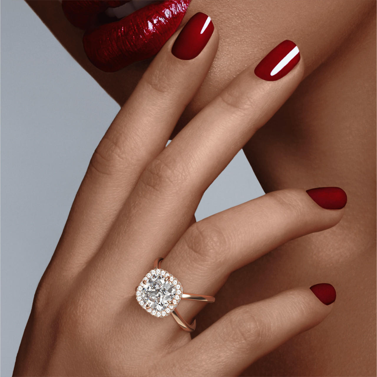 CUSHION CUT DIAMOND ENGAGEMENT RING WITH A WRAPPED HALO AXIS SETTING IN 18K ROSE GOLD