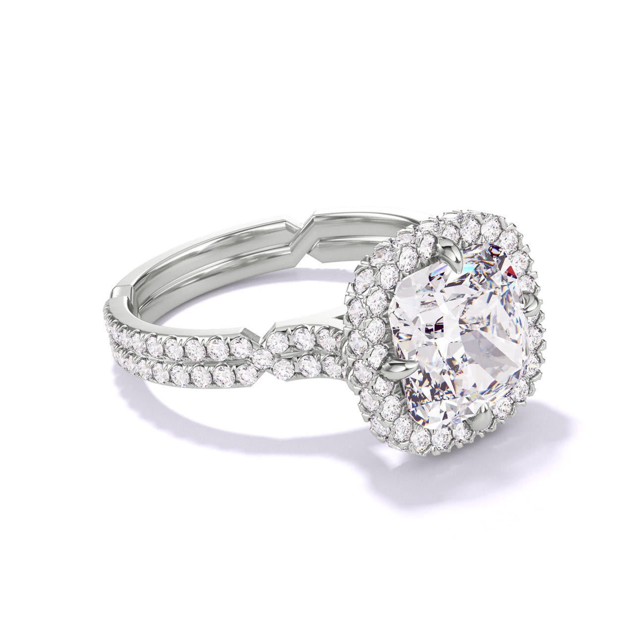 CUSHION CUT DIAMOND ENGAGEMENT RING WITH A WRAPPED HALO CHANCE PAVE SETTING IN PLATINUM