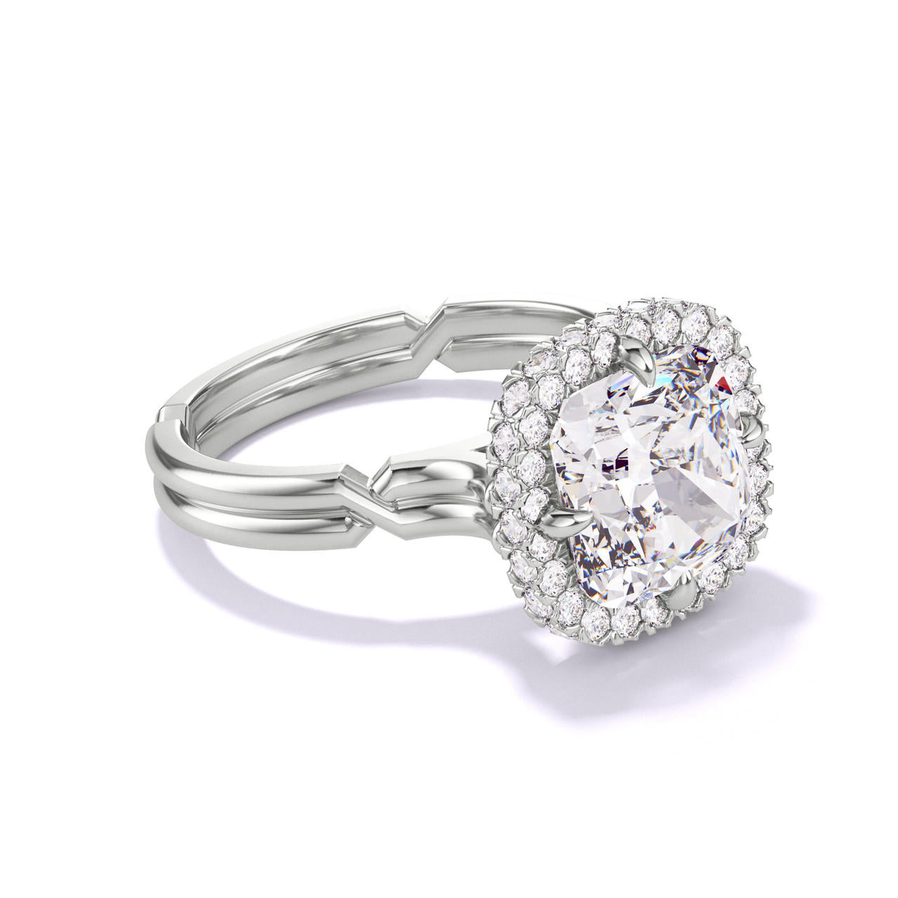 All Lindsey Scoggins Studio engagement rings are made exclusively for you in New York City’s Diamond District. Your cushion cut diamond engagement ring with a wrapped halo setting on a signature Chance collection band in platinum will be made to precisely fit your diamond and finger. The carat weight of this setting is approximately 0.5 carats for a size 6 and varies slightly by ring size.