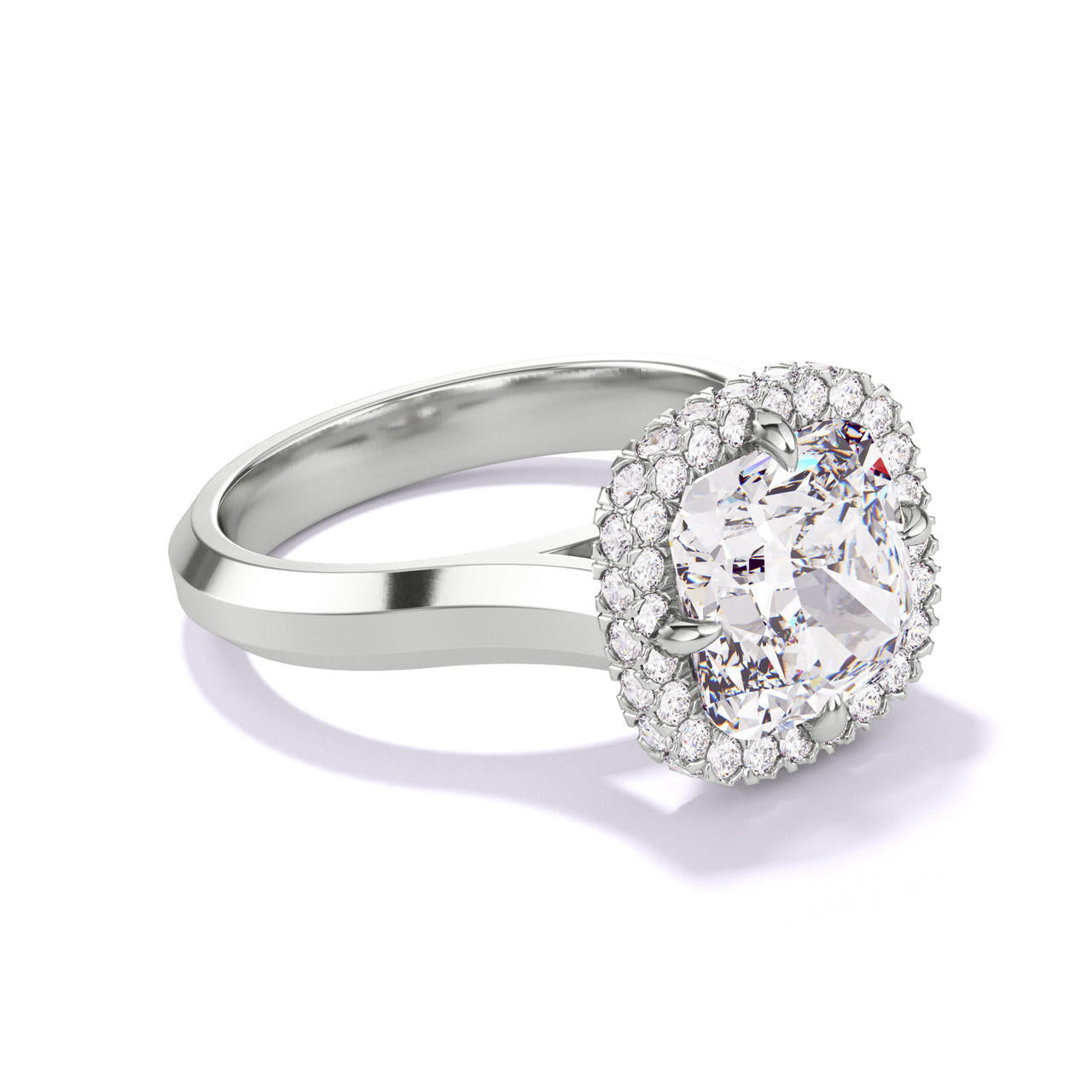 CUSHION CUT DIAMOND ENGAGEMENT RING WITH A WRAPPED HALO THREE PHASES SETTING IN PLATINUM