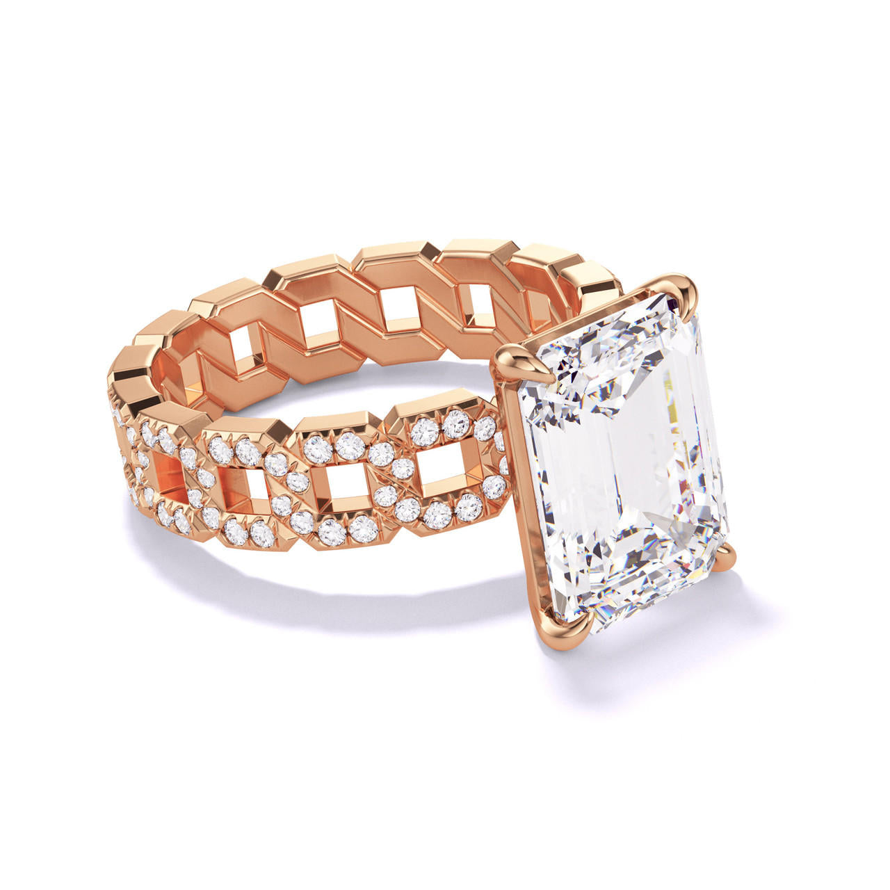 EMERALD CUT DIAMOND ENGAGEMENT RING WITH A CLASSIC 4 PRONG 16 PAVE LINKS SETTING IN 18K ROSE GOLD