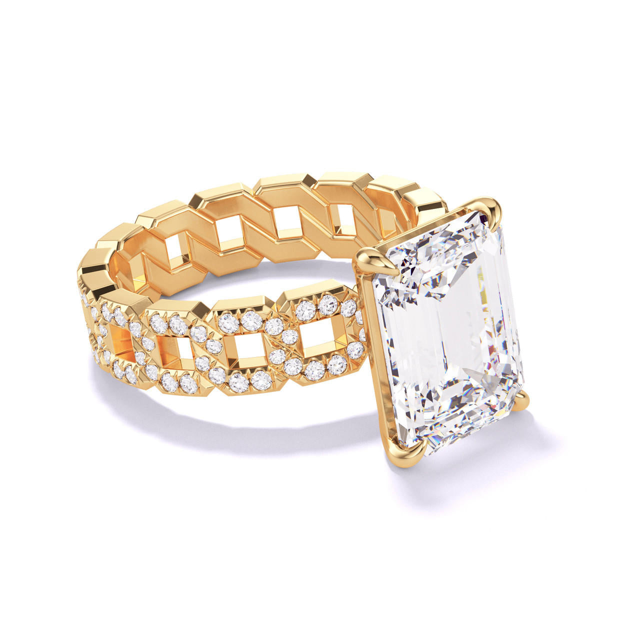 EMERALD CUT DIAMOND ENGAGEMENT RING WITH A CLASSIC 4 PRONG 16 PAVE LINKS SETTING IN 18K YELLOW GOLD