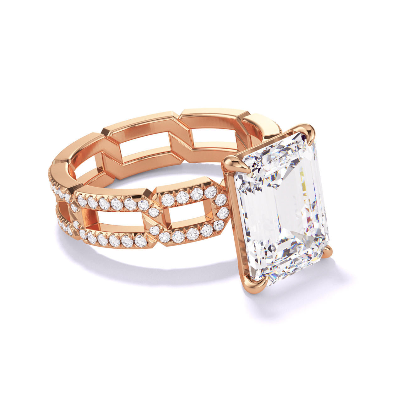 EMERALD CUT DIAMOND ENGAGEMENT RING WITH A CLASSIC 4 PRONG 8 PAVE LINKS SETTING IN 18K ROSE GOLD