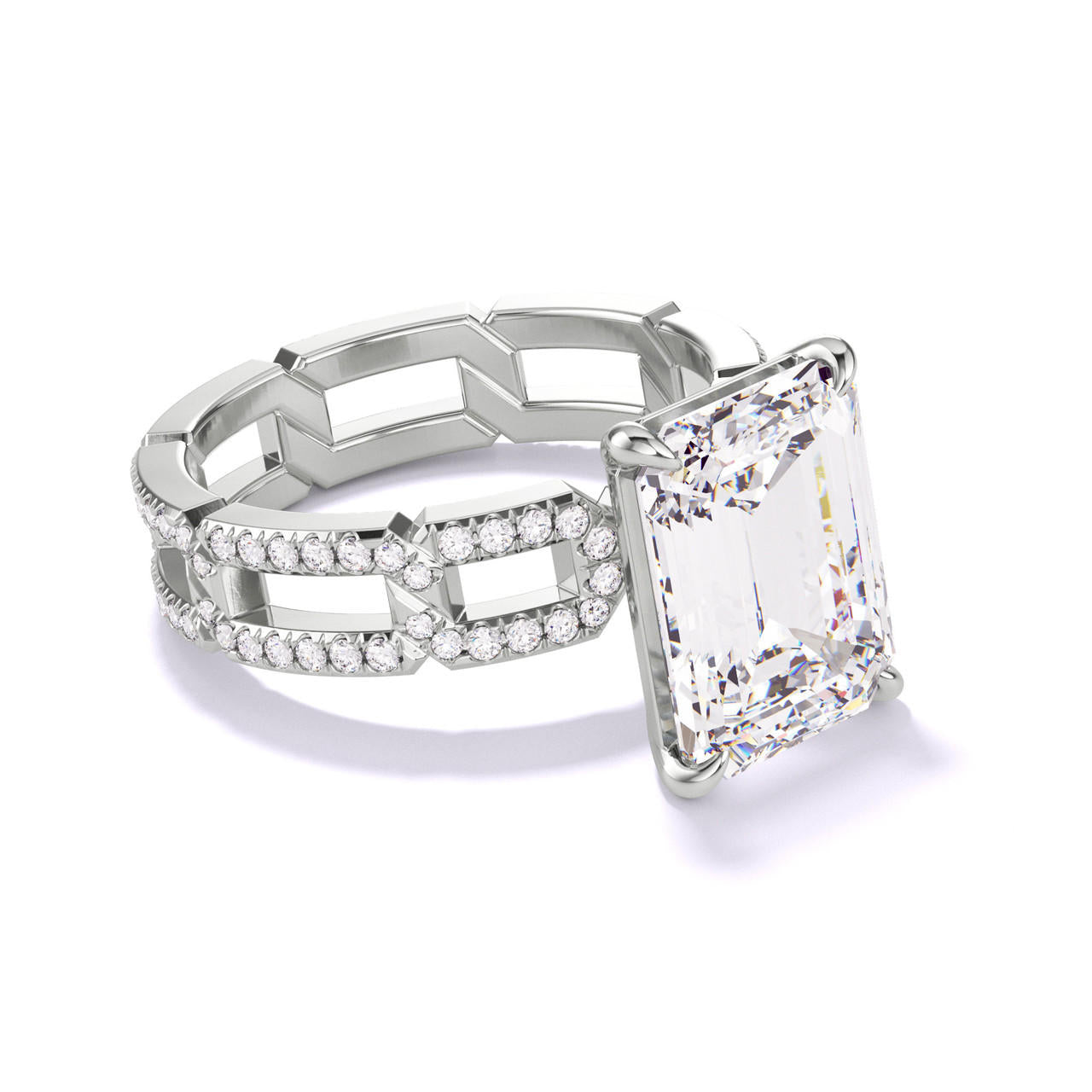 EMERALD CUT DIAMOND ENGAGEMENT RING WITH A CLASSIC 4 PRONG 8 PAVE LINKS SETTING IN PLATINUM