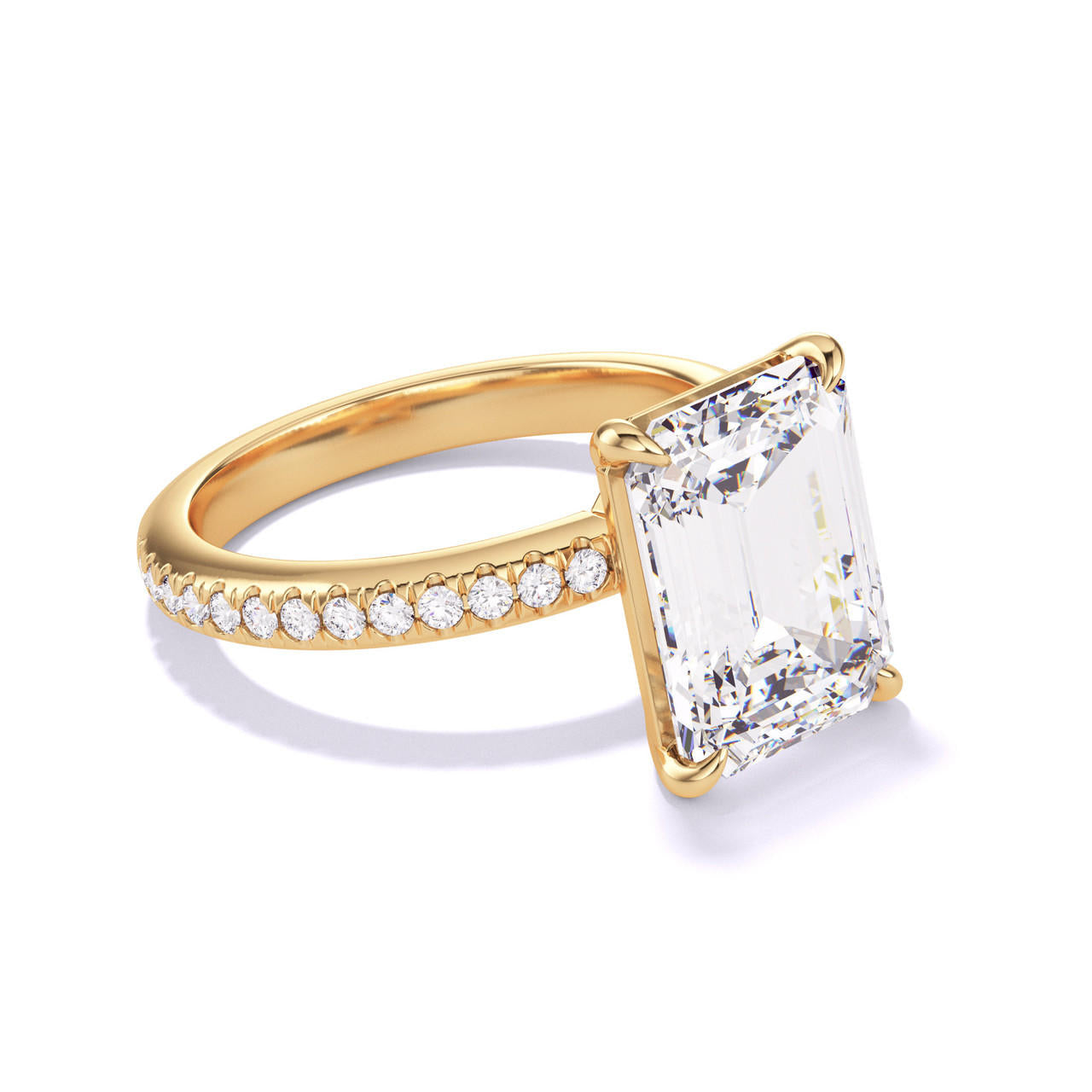 EMERALD CUT DIAMOND ENGAGEMENT RING WITH A CLASSIC 4 PRONG THREE PHASES PAVE SETTING IN 18K YELLOW GOLD