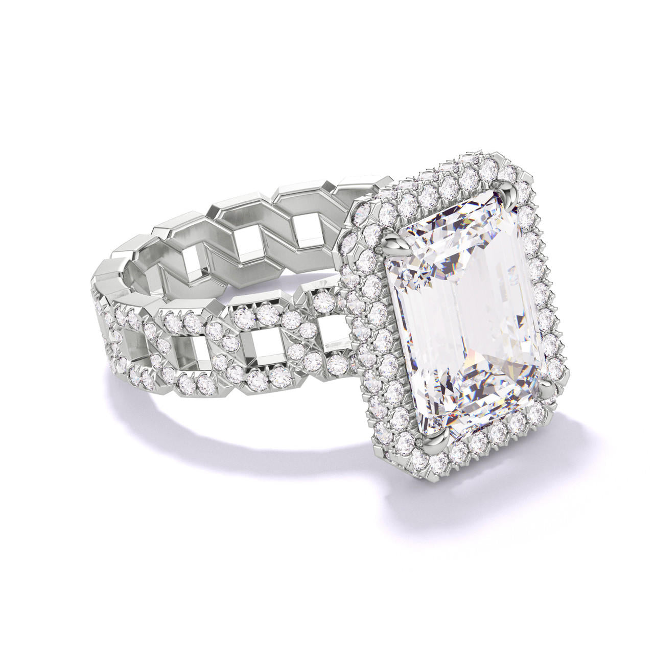 EMERALD CUT DIAMOND ENGAGEMENT RING WITH A WRAPPED HALO 16 PAVE LINKS SETTING IN PLATINUM