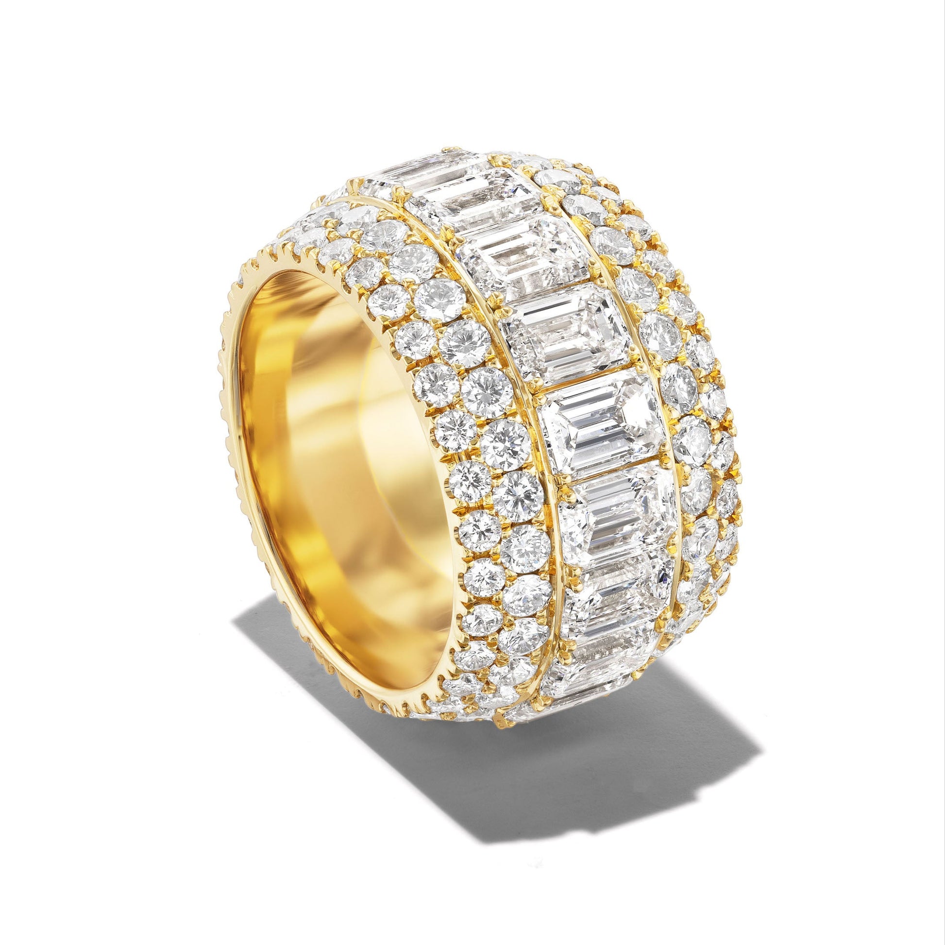 Whether you are looking for the most traditional gold band or want something entirely unique, we have unique wedding bands for every type of style. Pieces like this mega emerald cut diamond eternity band are modern with a contemporary twist. If you like this style in a slightly more understated way, our Three Row Pavé Three Phases band is another triple row diamond wedding band without the varied sizes of diamonds. For something even edgier, our Continuum collection eternity bands are uniquely designed to use one row of pavé diamonds that twist together to form a stunning and unique ring. Contact us today to learn more about our custom design process and to discuss the endless design and commission possibilities of this mega emerald cut diamond eternity band with pavé and so much more.