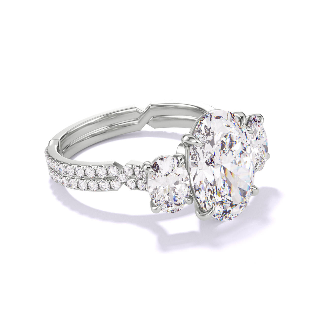 OVAL CUT DIAMOND ENGAGEMENT RING WITH A THREE STONE CHANCE PAVE SETTING IN PLATINUM