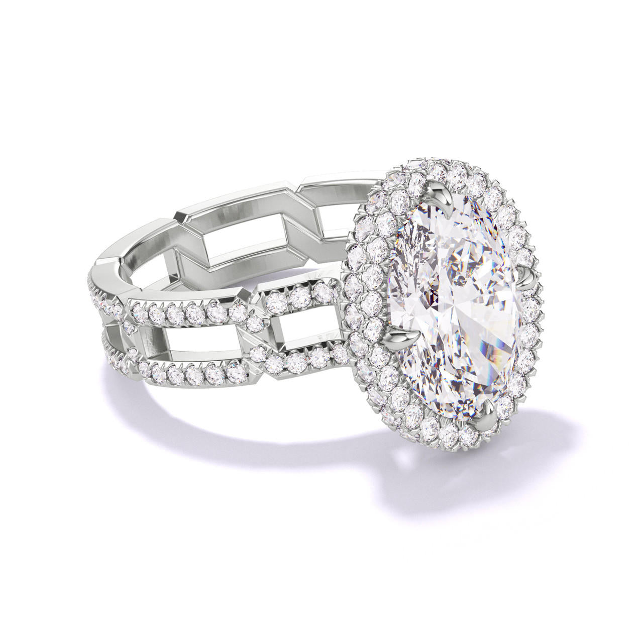 OVAL CUT DIAMOND ENGAGEMENT RING WITH A WRAPPED HALO 8 PAVE LINKS SETTING IN PLATINUM