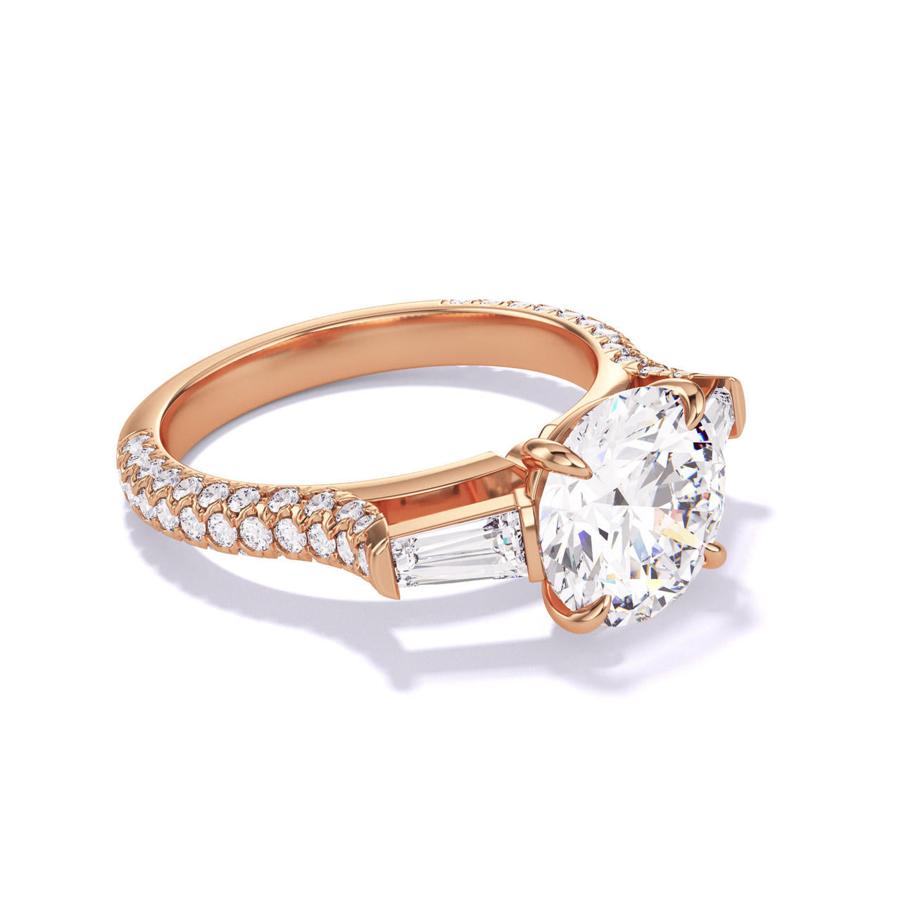 ROUND CUT DIAMOND ENGAGEMENT RING WITH A BAGUETTE FLANK THREE PHASES TRIPLE PAVE SETTING IN 18K ROSE GOLD