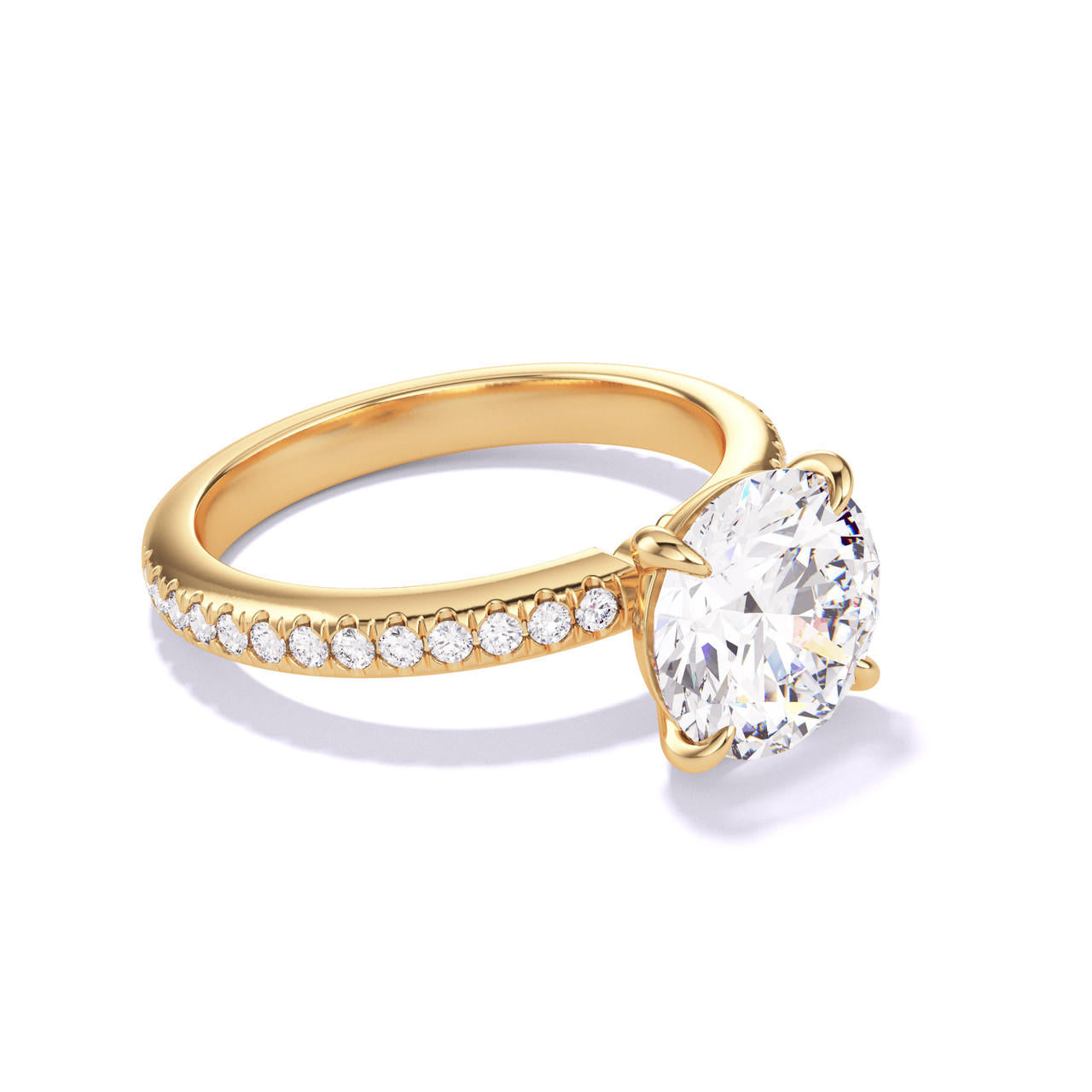 ROUND CUT DIAMOND ENGAGEMENT RING WITH A CLASSIC 4 PRONG THREE PHASES PAVE SETTING IN 18K YELLOW GOLD