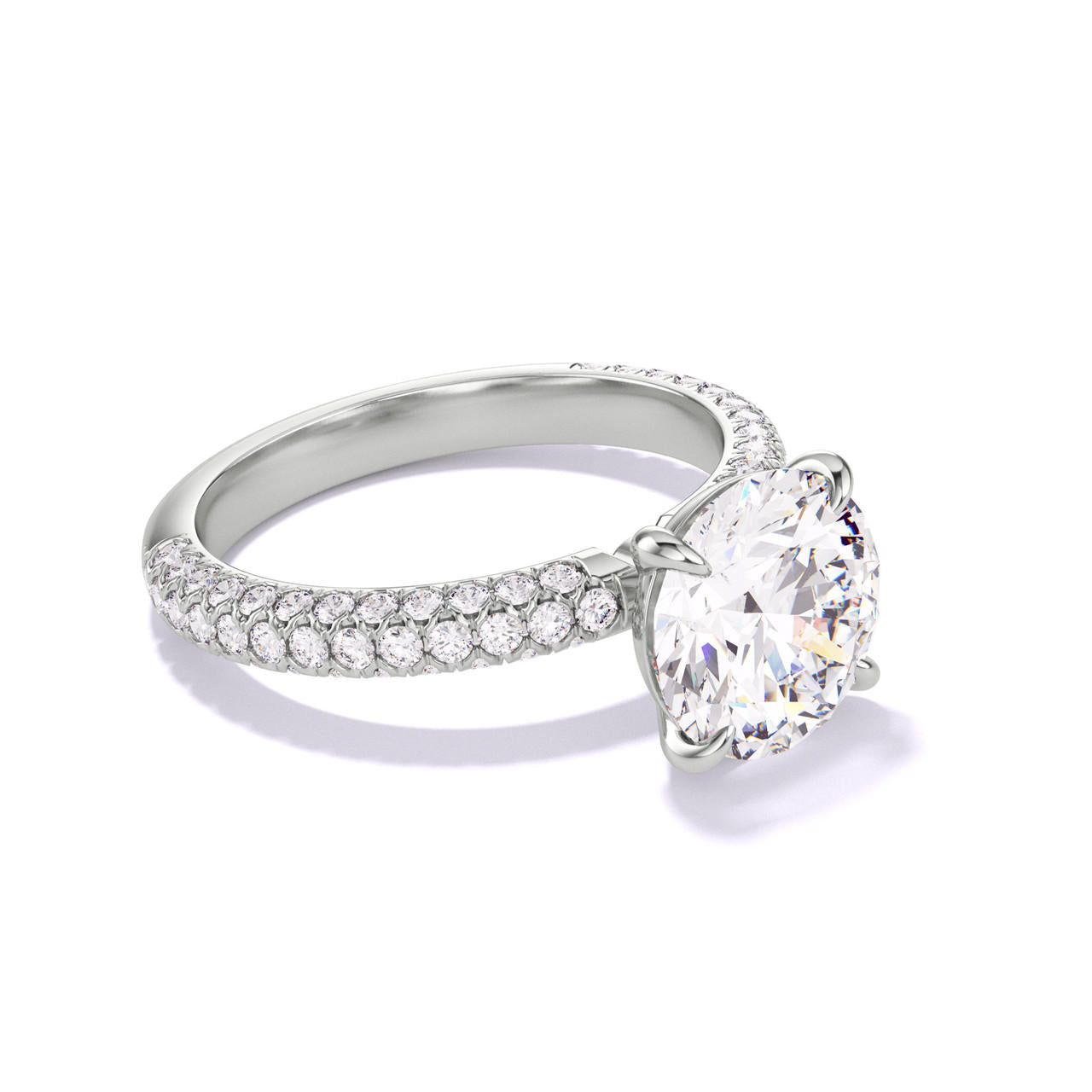 ROUND CUT DIAMOND ENGAGEMENT RING WITH A CLASSIC 4 PRONG THREE PHASES TRIPLE PAVE SETTING IN PLATINUM