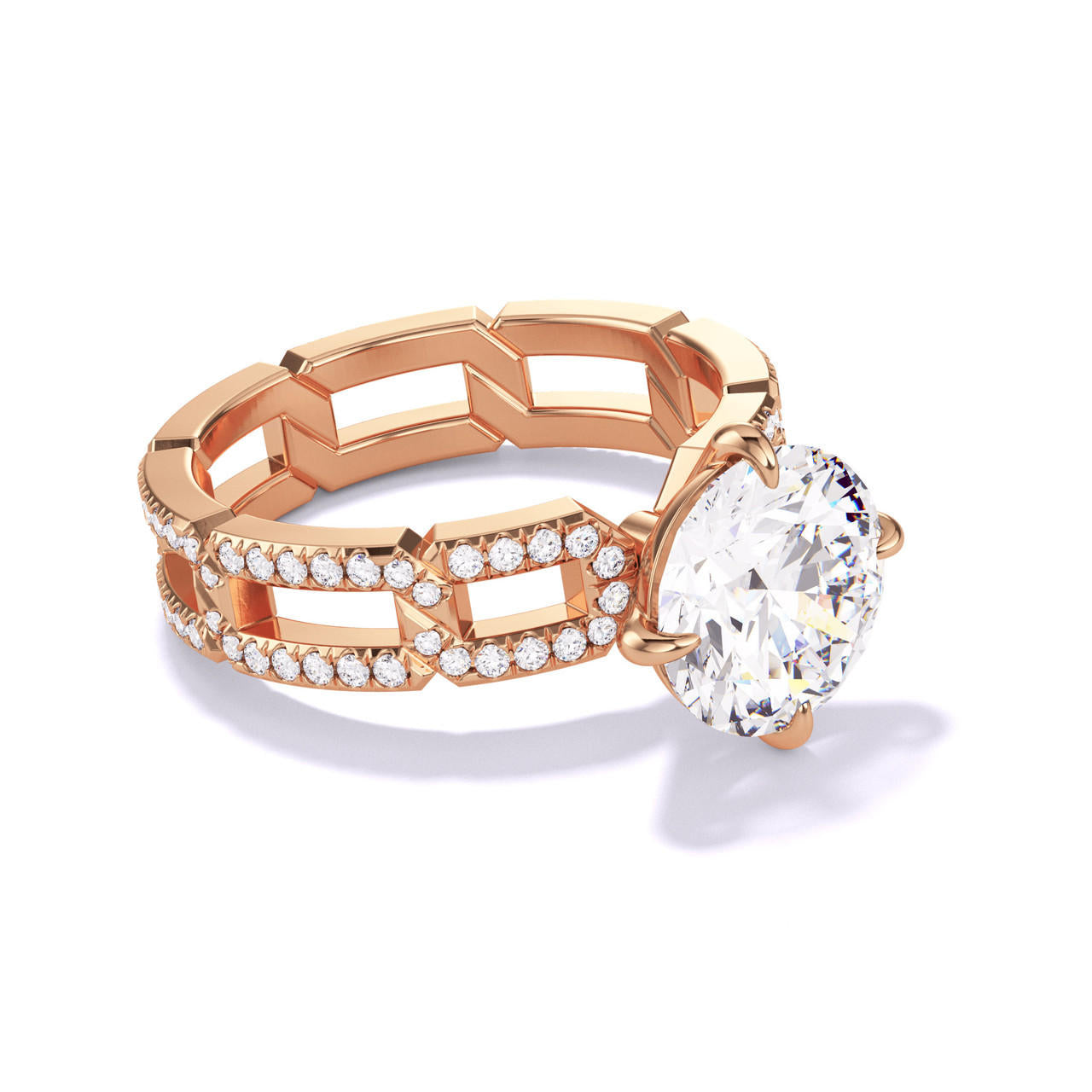 ROUND CUT DIAMOND ENGAGEMENT RING WITH A COMPASS 4 PRONG 8 PAVE LINKS SETTING IN 18K ROSE GOLD