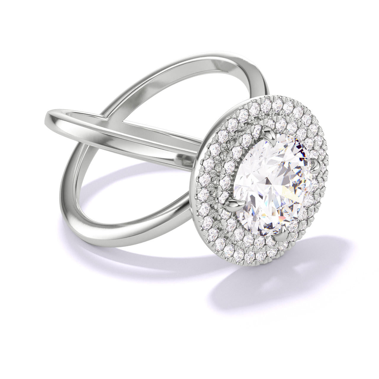ROUND CUT DIAMOND ENGAGEMENT RING WITH A DOUBLE HALO AXIS SETTING IN PLATINUM