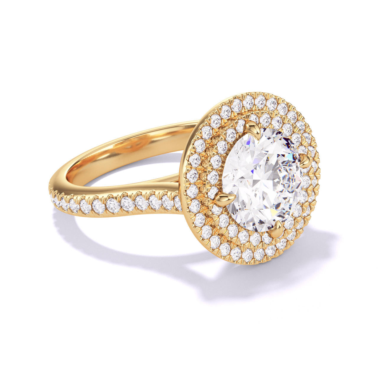 ROUND CUT DIAMOND ENGAGEMENT RING WITH A DOUBLE HALO THREE PHASES PAVE SETTING IN 18K YELLOW GOLD