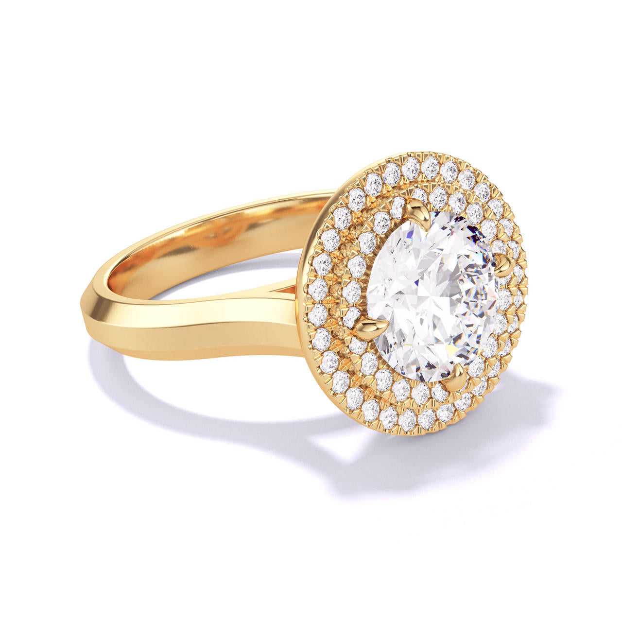 ROUND CUT DIAMOND ENGAGEMENT RING WITH A DOUBLE HALO THREE PHASES SETTING IN 18K YELLOW GOLD