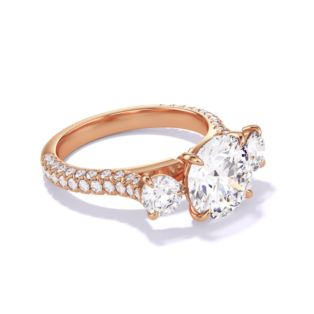 ROUND CUT DIAMOND ENGAGEMENT RING WITH A THREE STONE THREE PHASES TRIPLE PAVE SETTING IN 18K ROSE GOLD