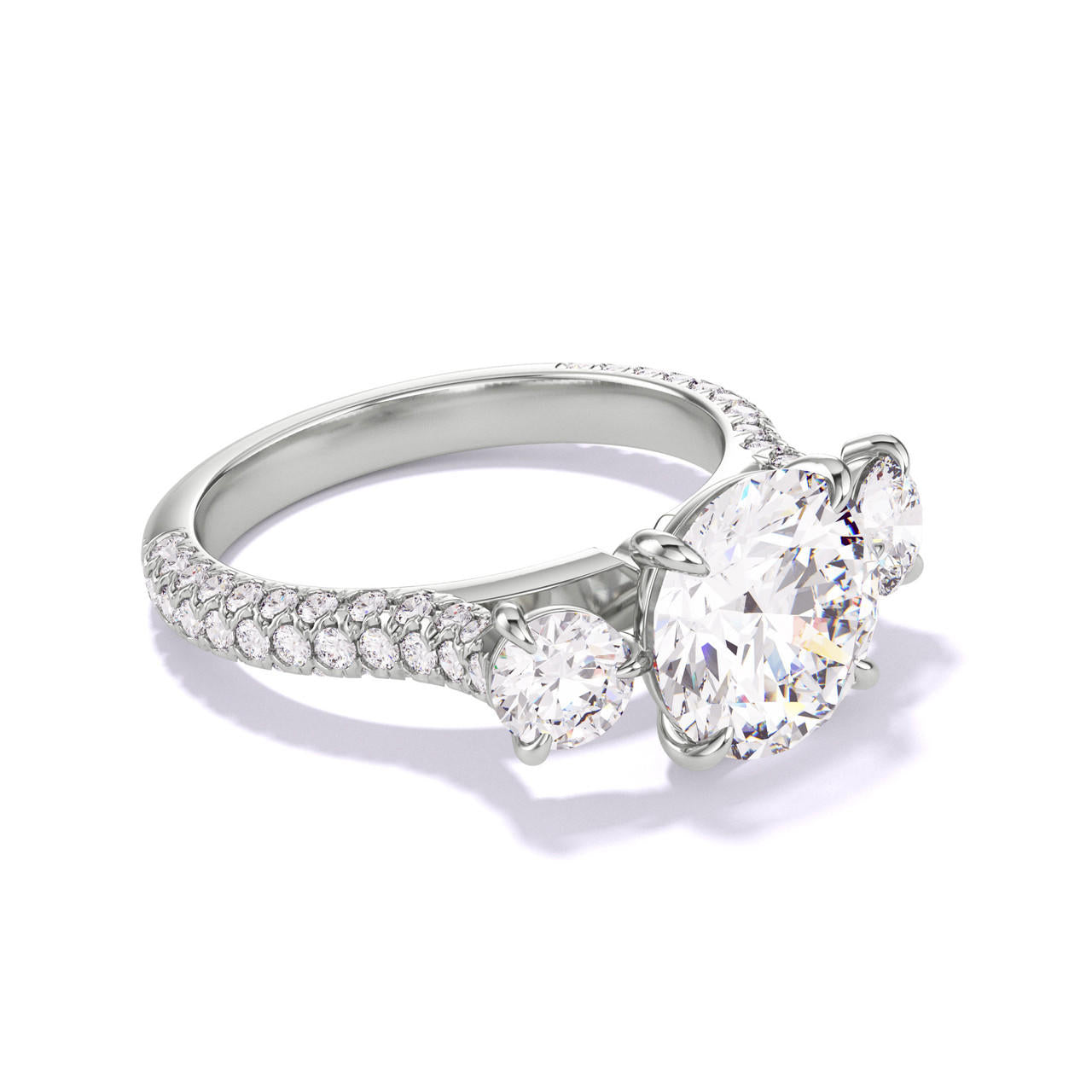 ROUND CUT DIAMOND ENGAGEMENT RING WITH A THREE STONE THREE PHASES TRIPLE PAVE SETTING IN PLATINUM